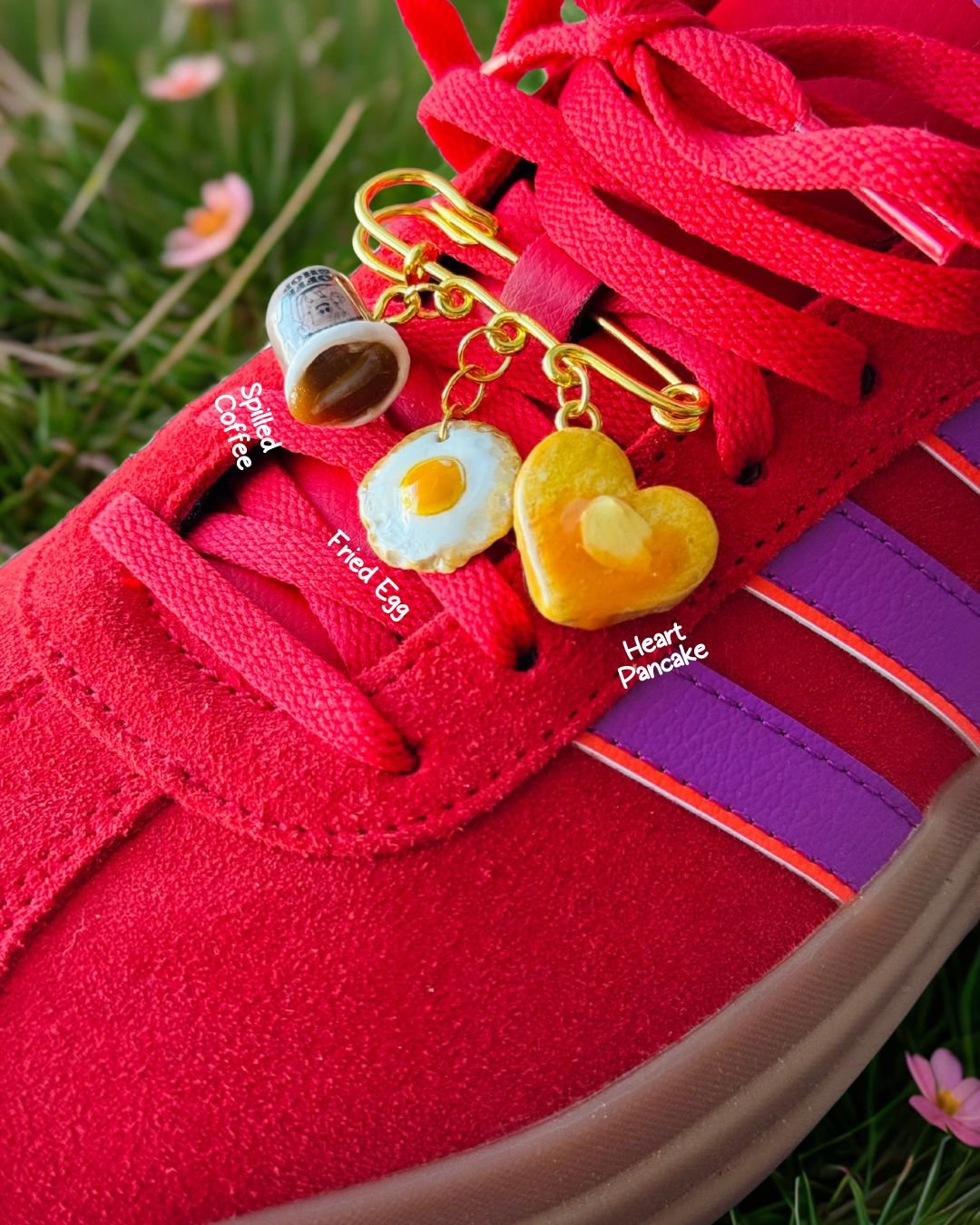 This handmade sneaker charm pin features three polymer clay charms—coffee, egg, and heart—designed to add personality and charm to your everyday sneakers.