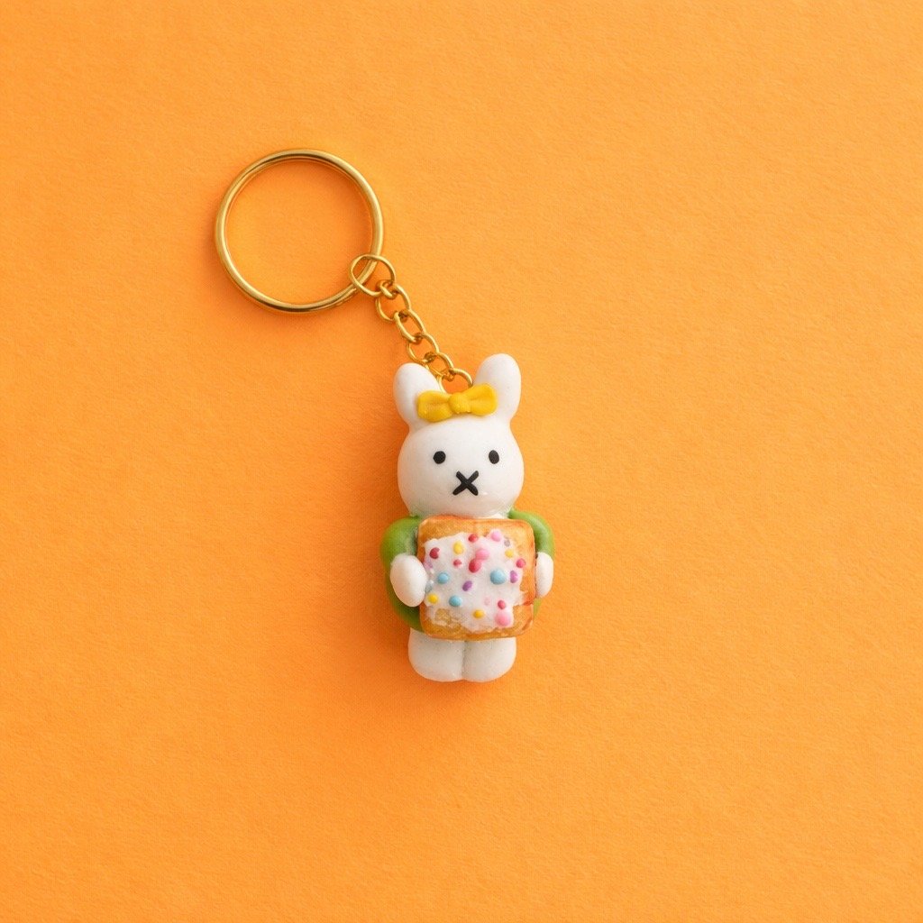 A cheerful bunny holding a colorful sprinkle toast snack. This handmade charm brings bright, bakery-inspired fun to your everyday accessories.